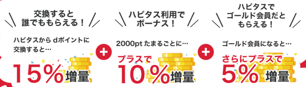 ハピタスのゴールド会員であれば、dポイントへの交換が4%増量されるというわけですね!!