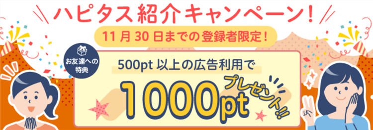 こちらはハピタスの紹介キャンペーンで11月1日~11月30日に利用した広告が、12月31日までに合計500pt以上獲得(通帳へ「有効」と記載)されると、1,000ptプレゼント!