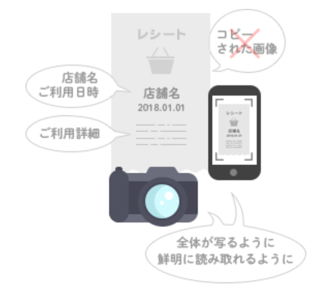 は受理できません。レシート原本をデジカメや携帯電話のカメラなどで直接撮影いただきますよう、