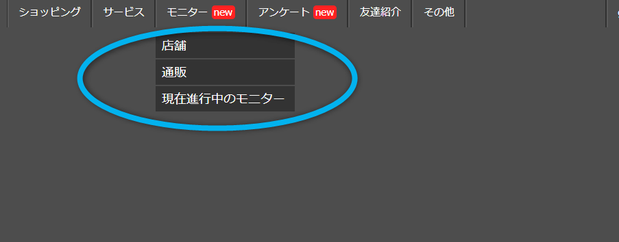 すると「店舗」「通販」「現在進行中のモニター」が表示されます。
