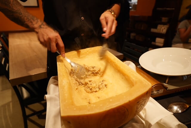 こちらではスタッフが目の前でたっぷりのチーズを絡めながら調理をしてくれる。