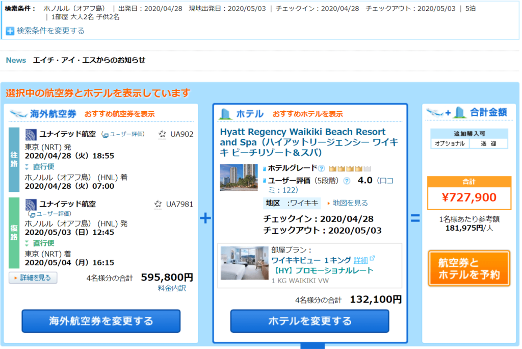 - ホテルはハイアットリージェンシーであれば132,100円(4人分で5泊)