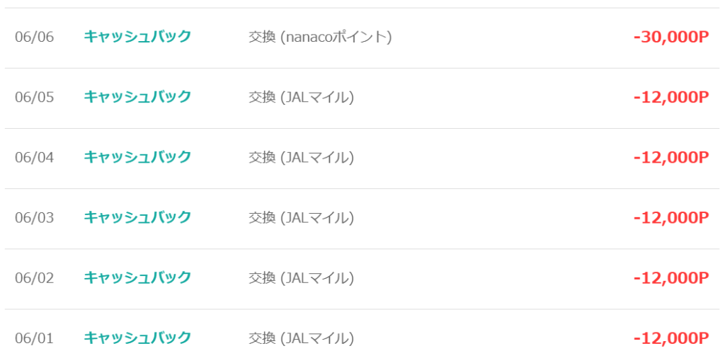 これは今まで貯めたポイントを今月に入ってから一気に交換した分です。JALマイルに交換が5回分なので3万JALマイル分ですかね?