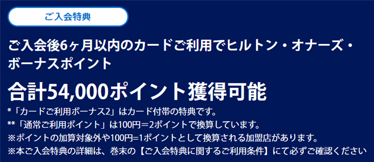 まずは通常のヒルトンアメックスカードの入会特典は合計54,000ポイントが貰えるようになっていますよ。