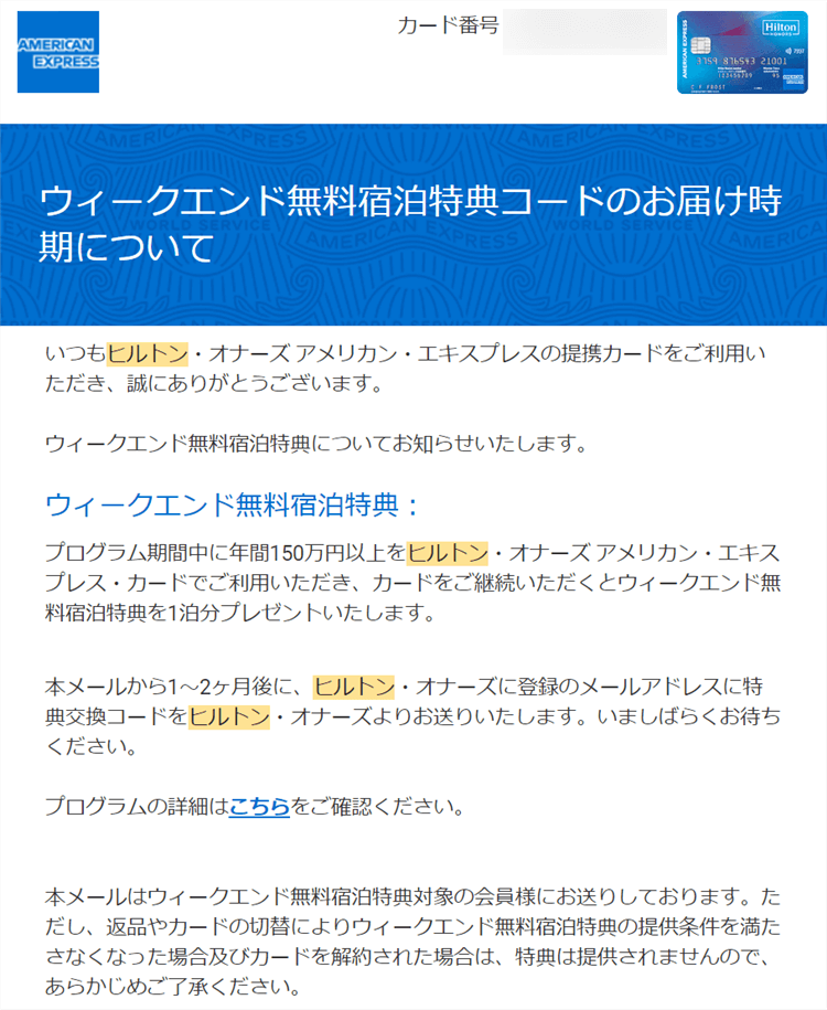 私はヒルトンアメックスカードを9月に発行しているのですが、ちょうど更新月である9月にウィークエンド無料宿泊特典コードのお届け時期を知らせるメールが入っていました!!