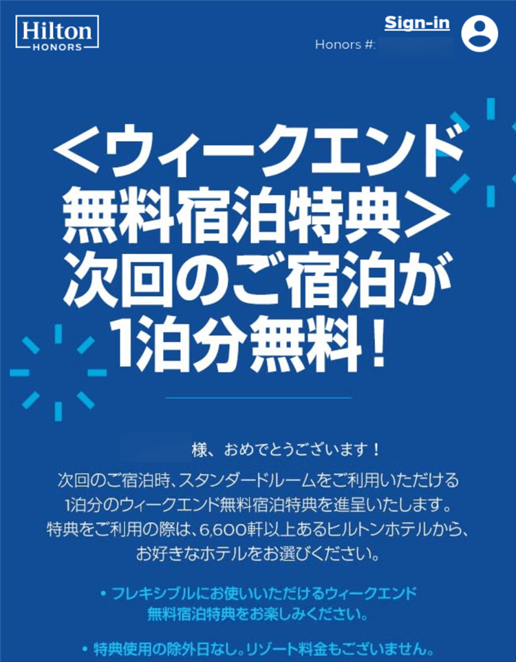 <ご継続ボーナス: ウィークエンド無料宿泊特典>