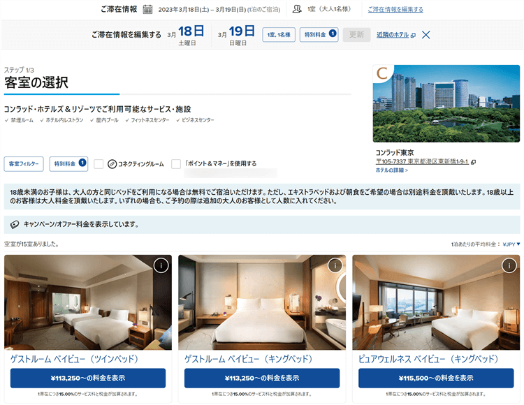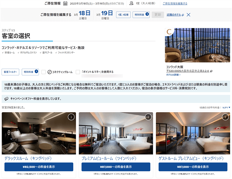 そして同じくコンラッドブランドの大阪ですが、東京よりもリーズナブルながらも同日日程で8万円となっています。