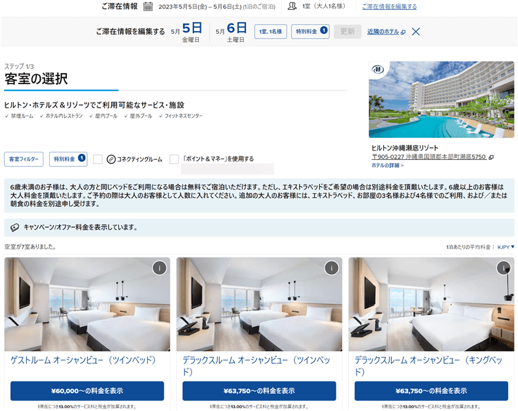 ヒルトン沖縄瀬底リゾートのGWで60,000円なので、いいタイミングで利用するといいですよね!!