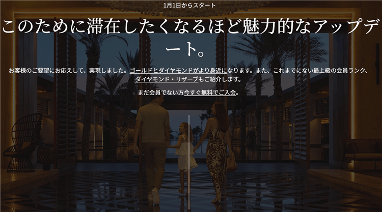 | ダイヤモンド | (1)25回のご滞在完了(これまでは30回) (2)50泊のご宿泊(これまでは60泊) (3)対象となる年間ご利用金額$11,500 USDの達成(これまでは120,000ベースポイント) 上記の3つのうちどれか1つ達成で資格取得 |