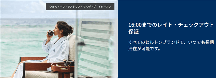 ダイヤモンド・リザーブ会員のお客様には、ヒルトン・ポートフォリオのブランドおよびオートキャンプでのすべての対象となるご滞在に、16:00までのレイト・チェックアウト保証が自動的に適用されます。ホテルにリクエストしていただく必要はありません(すべてのパートナー宿泊施設に自動適用されるわけではありません)。