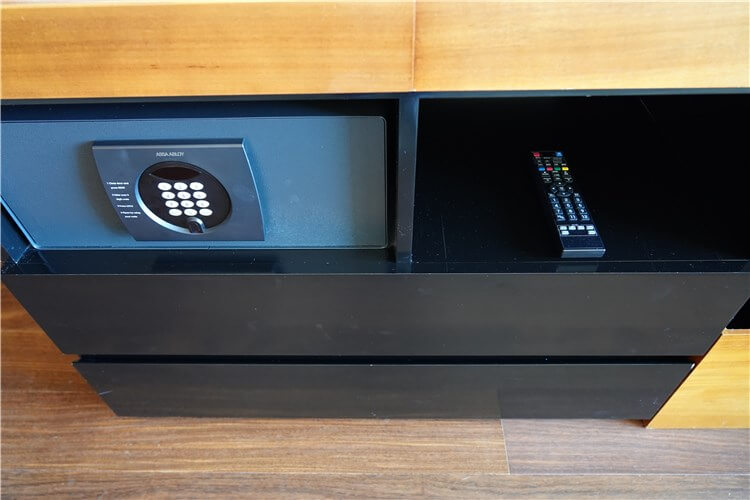 テレビが置かれたテーブルデスクの下にはテレビのリモコン、セキュリティーボックスがあります。