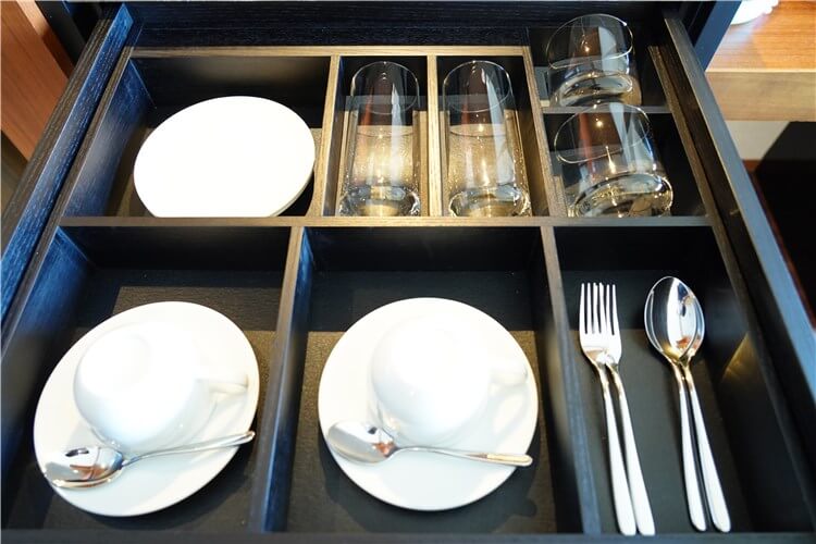 その下の引き出しにはコーヒーカップやカトラリー一式がセットされています。