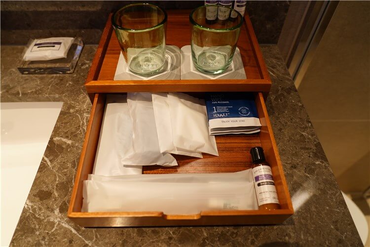 アメニティ類は右のコップの棚の下にセットされていますよ!