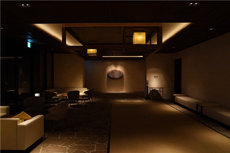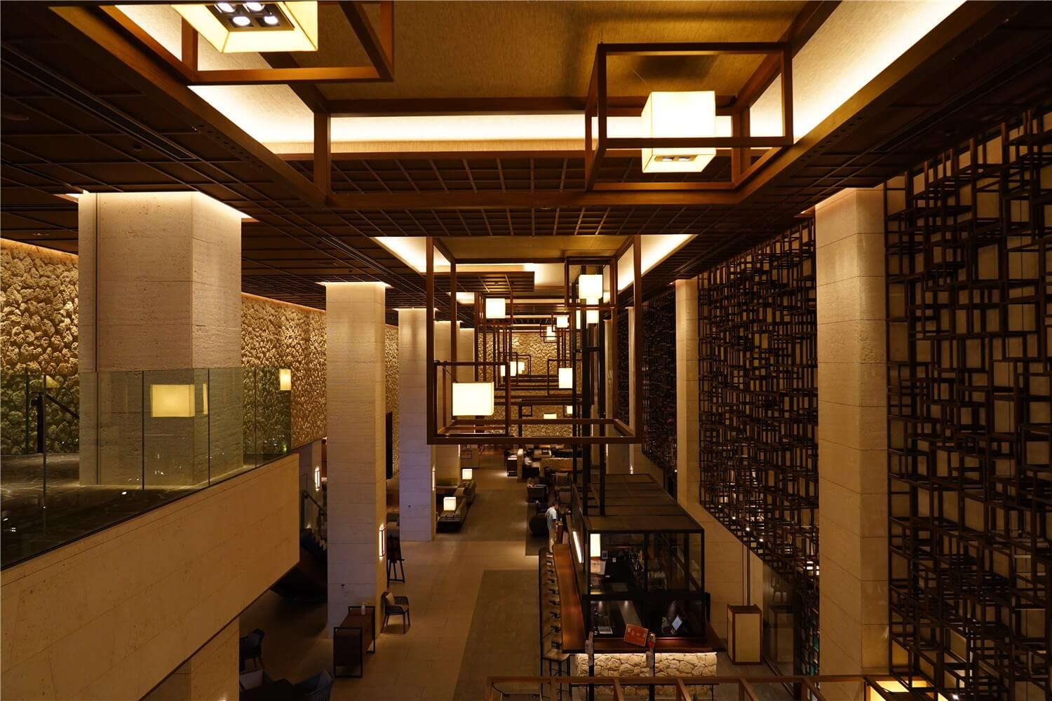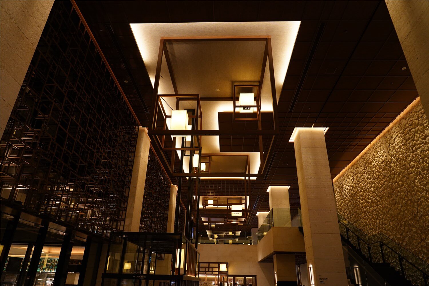天井から下がっている照明の置き方、格子のバランス、太い大きな柱、どれもが本当に美しく縛らしいデザイン美となっています。