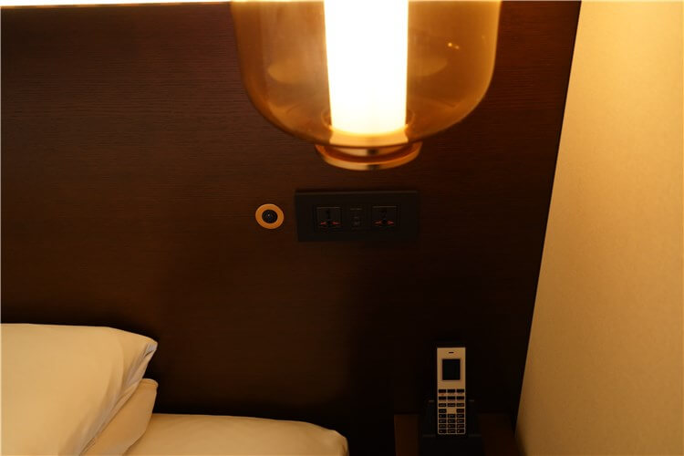 ツインタイプのベッドですがミニテーブルには時計、ヘッドボードにはコンセントやUSB、ライトの調整が出来るようになっています。