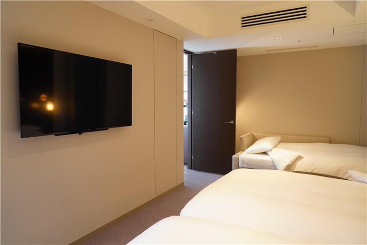 リビングの奥にはベッドルームがあるのですが、ミニバーの棚のところとテラス側と2か所にドアがあるのが特徴的ですね!