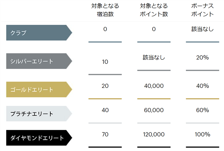 | 加算対象の宿泊または加算対象のポイント | 10 | 20泊または40,000ポイント | 40泊または60,000ポイント | 70泊または120,000ポイント | |