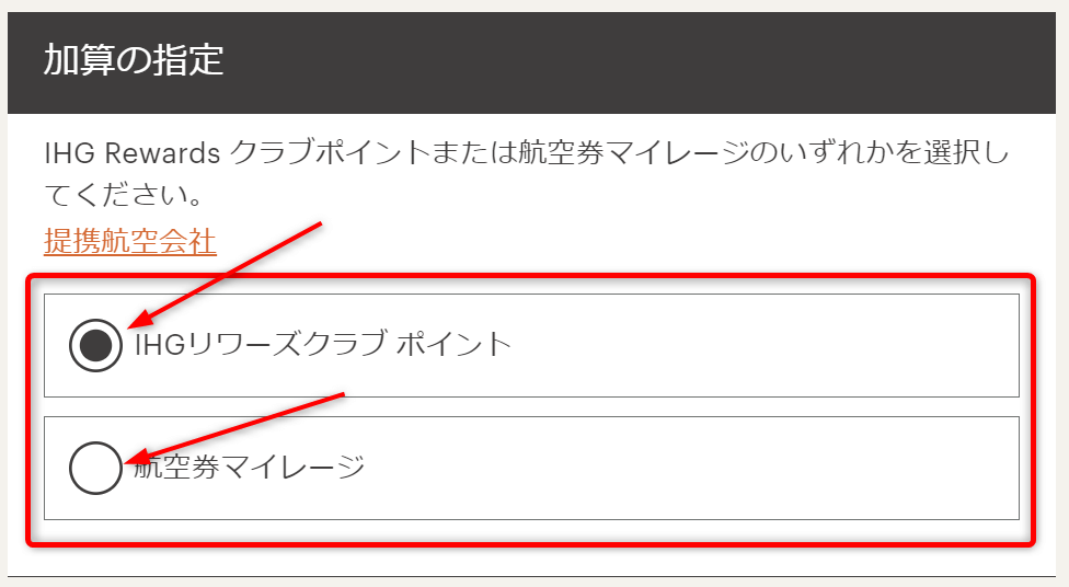 その中に「加算の指定」という項目があり、こちらでIHGリワーズクラブポイントもしくは航空券マイレージを選択できるようになっているんです。