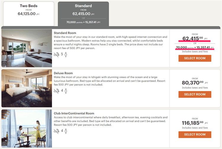 こちらはある日程のANAインターコンチネンタル別府リゾート&スパの料金とポイント数になります。
