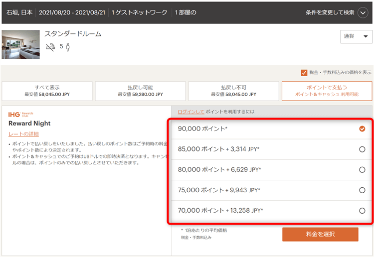 このように全額ポイント支払いをする(無料宿泊)と一部現金を使用する「ポイント&キャッシュ」が見ることができます。