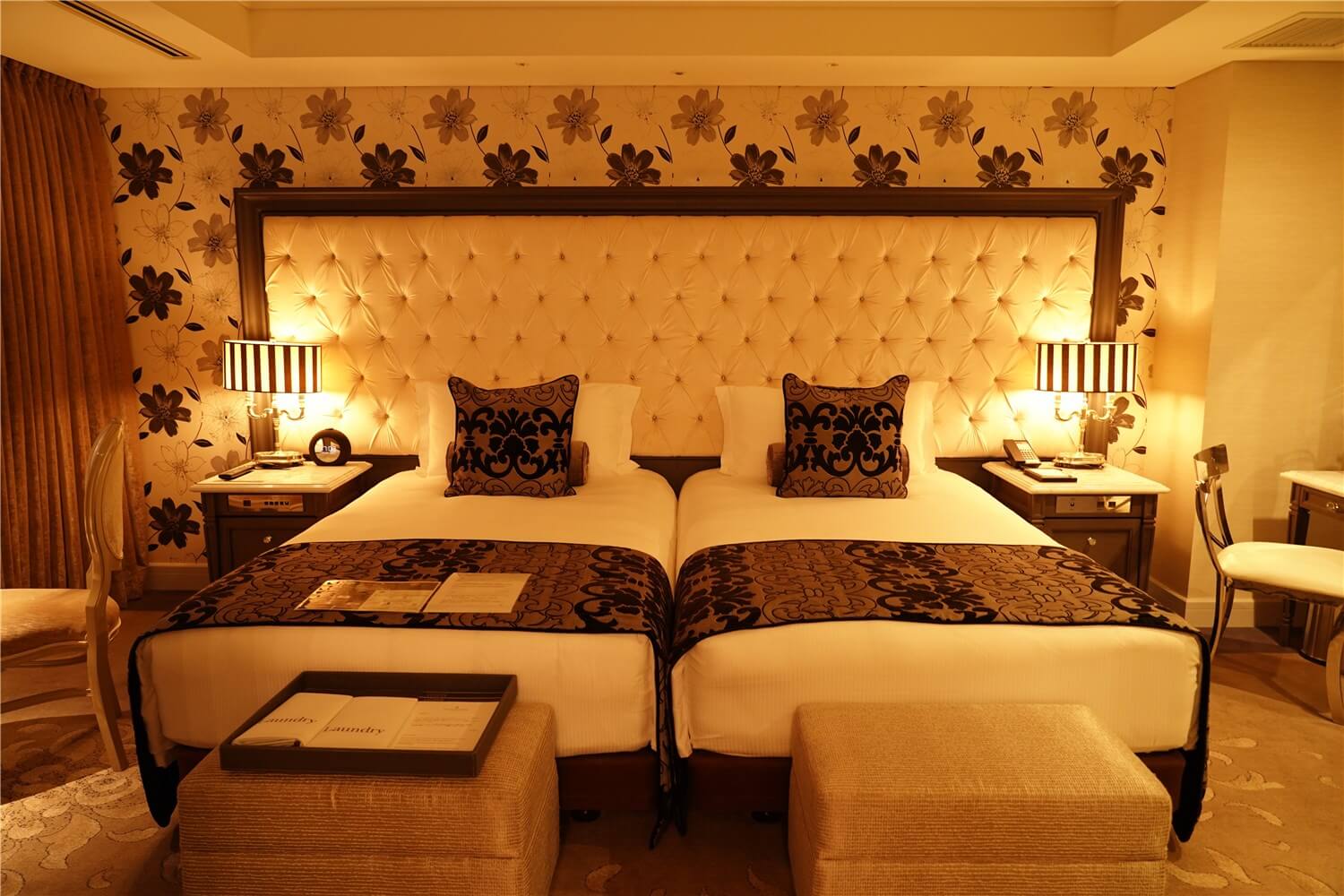ベッドルームもアンティーク調で優雅!ツインベッドで夜景を楽しむ