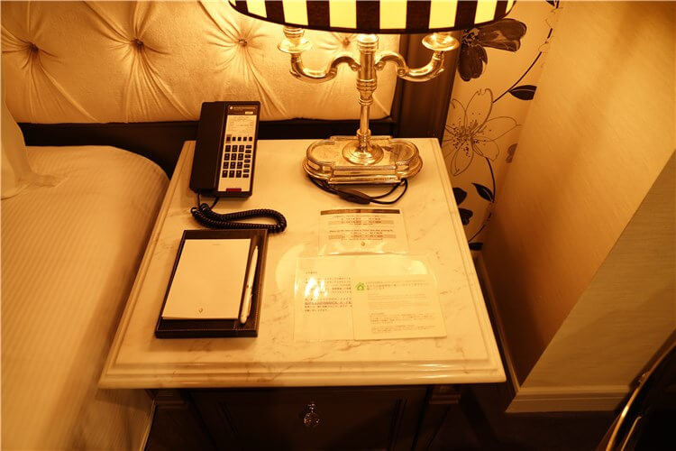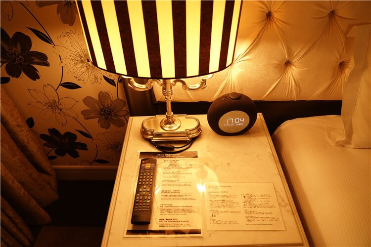 サイドチェストにはメモ帳や電話、クロックやテレビリモコンが置いてありました。