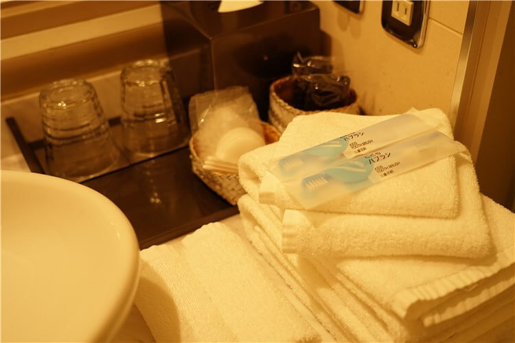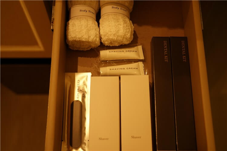引き出しを開けるとボディタオルに歯ブラシなどのキットがセットされていました。