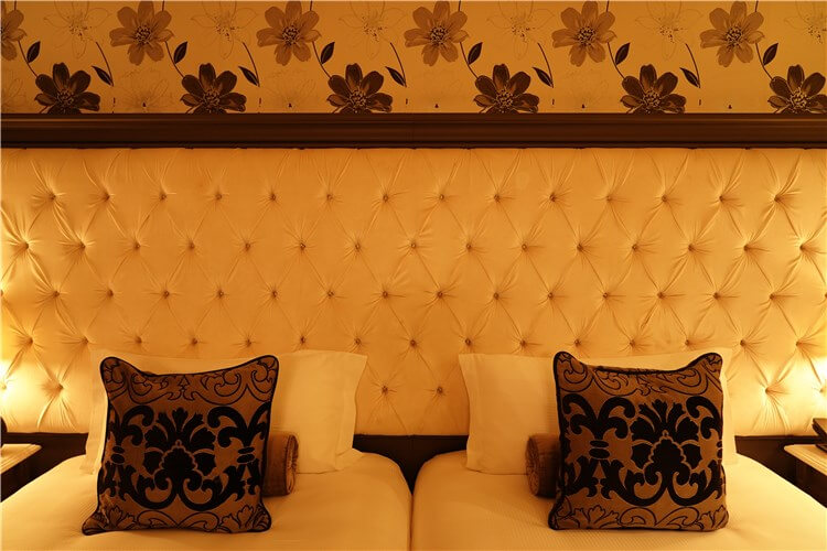 壁紙の雰囲気、ヘッドボードのレザー、枕元には2種類のクッションと非常に凝ったデザインになっています。
