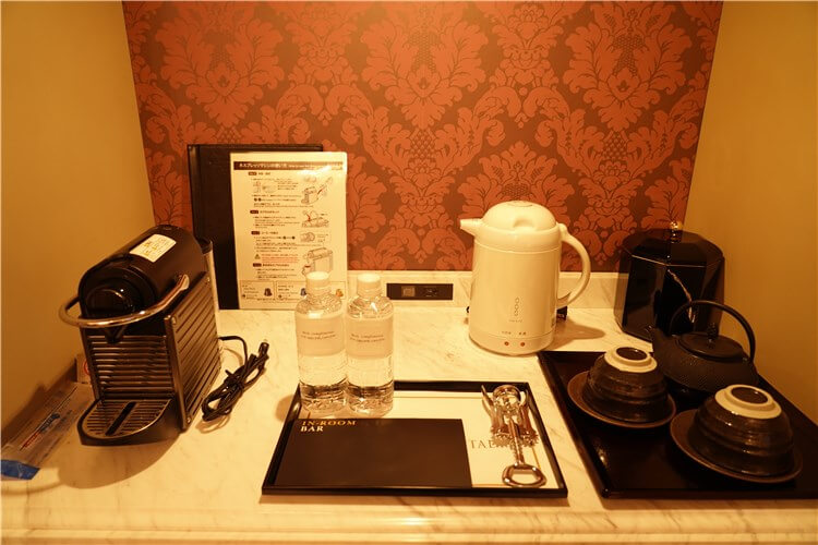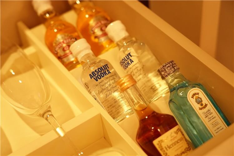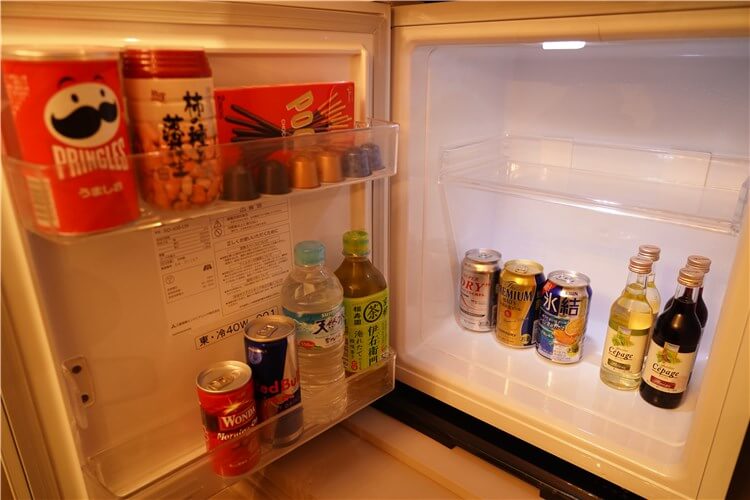 下段にはミニ冷蔵庫があり、ミネラルウォーターやアルコール類もあります。