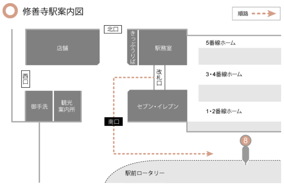 ●全日運行、無料 ●所要時間:約25分 ●修善寺駅、東海バス乗り場:8番線より出発