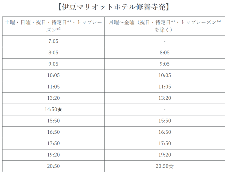 ※電車到着時刻とバス発車時刻に余裕がない場合は、伊豆箱根鉄道の前よりの車両にご乗車ください。*¹特定日: