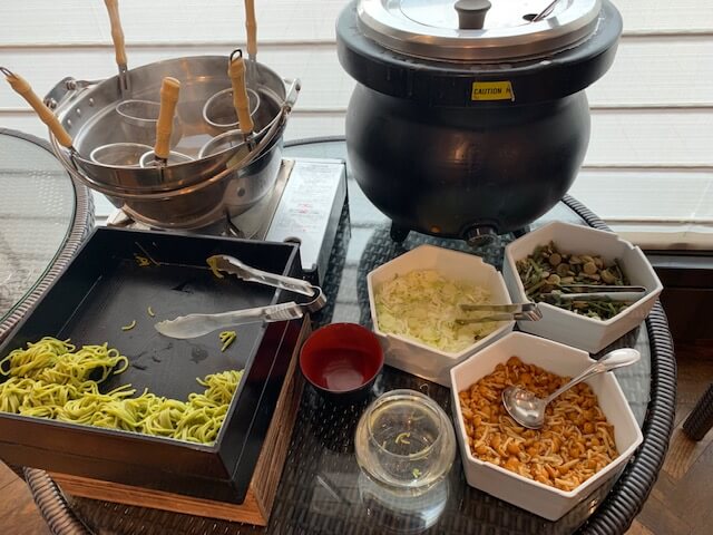 こちらは自分で茹でて頂くスタイルになります。ネギ、山菜、なめこを入れて楽しみます!