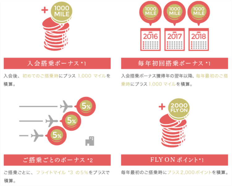 - 搭乗ボーナスマイル・FLY ONポイントの優遇