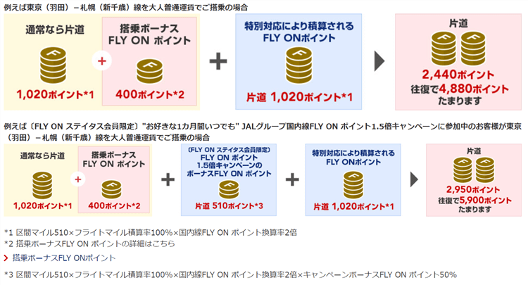 JALカード会員限定初回搭乗、搭乗ボーナスなどキャンペーンによるFLY ON ポイントは2倍での積算の対象外となります。