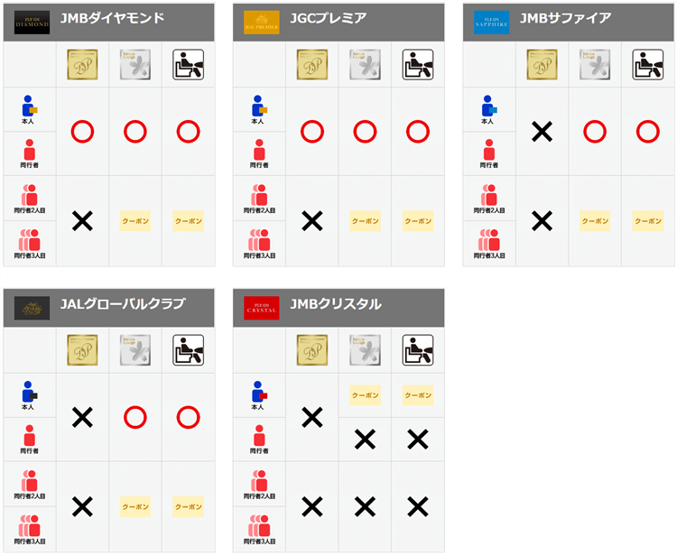 それと一番下のJMBクリスタル会員の方は、ラウンジクーポンを利用することで本人のみラウンジを利用することができるようになっています。