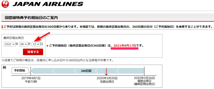 こちらはJAL公式サイトで自分が行きたい日付けを入れると予約開始日を自動計算して出してくれるものです。