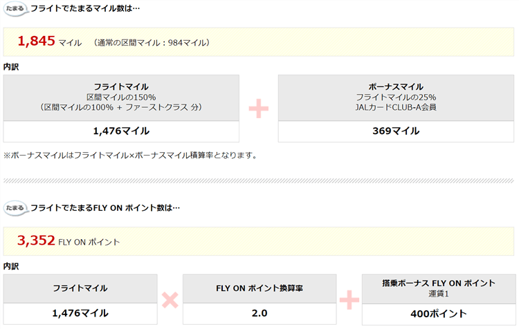 1,476(フライトマイル)×2(FLY ON ポイント換算率)×2(FOP2倍キャンペーン)+400=6,304FOP