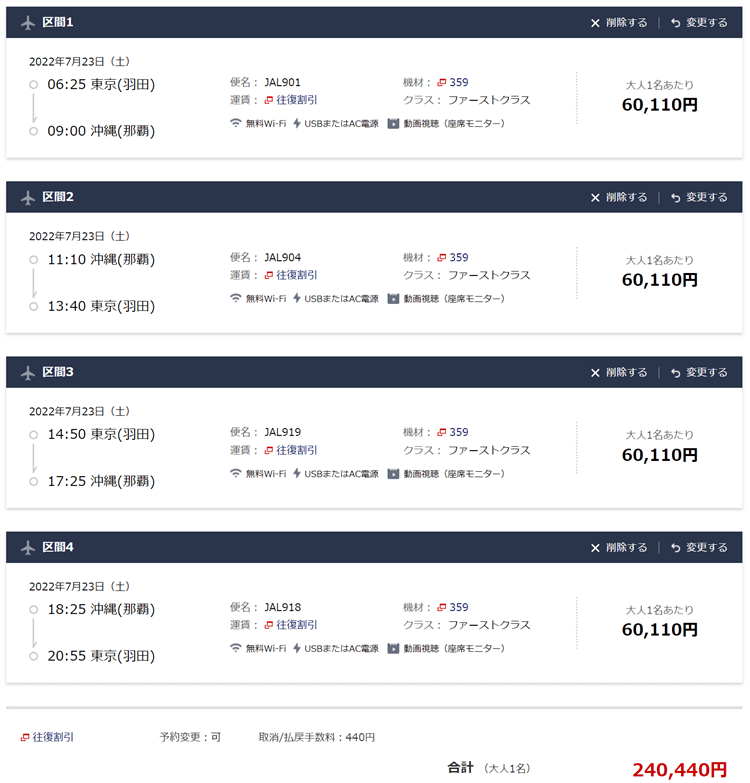 現在7月の羽田-那覇のファーストクラスですが、往復割引で片道60,110円となっています。