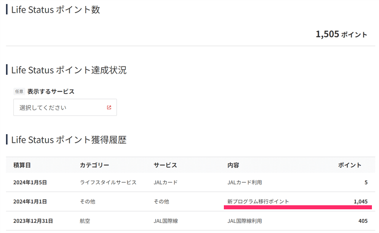 それで実際にどうなったのかというと、「新プログラム移行ポイント」として調整ポイントが付与されて1,500Life Status ポイントに到達した形に切り替わりましたよ!