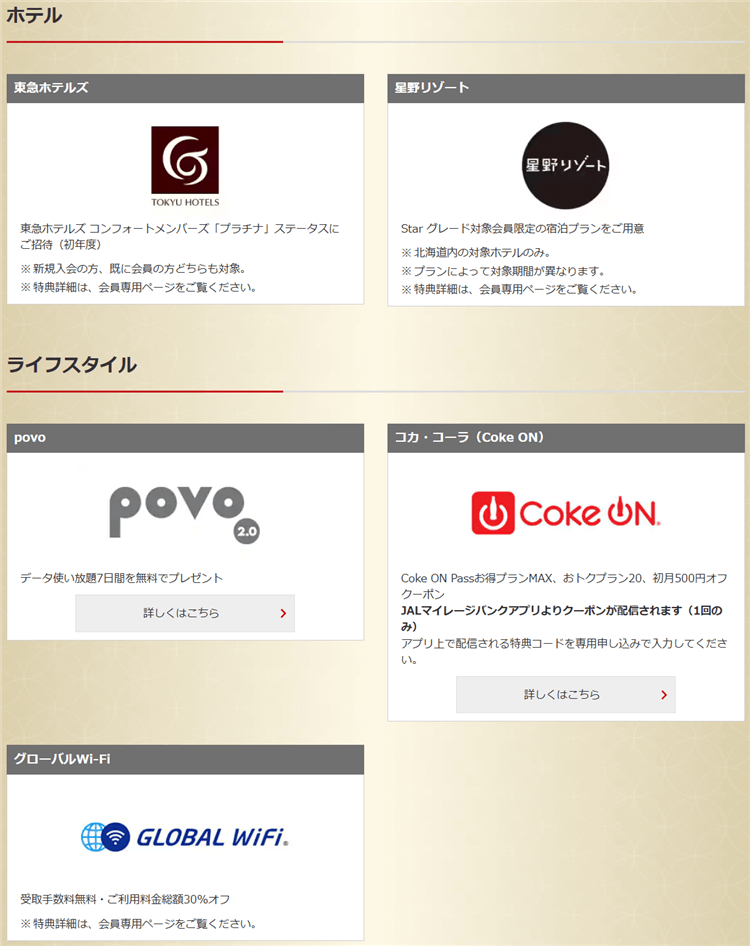 またJALのパートナー企業からの特典というものもあります。
