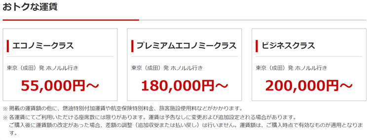 | 東京-ホノルル | 59,800円から | 19,800円から | 7,000円(定額) |