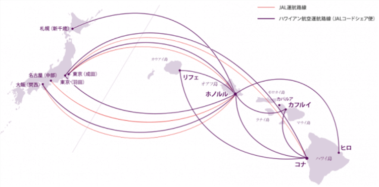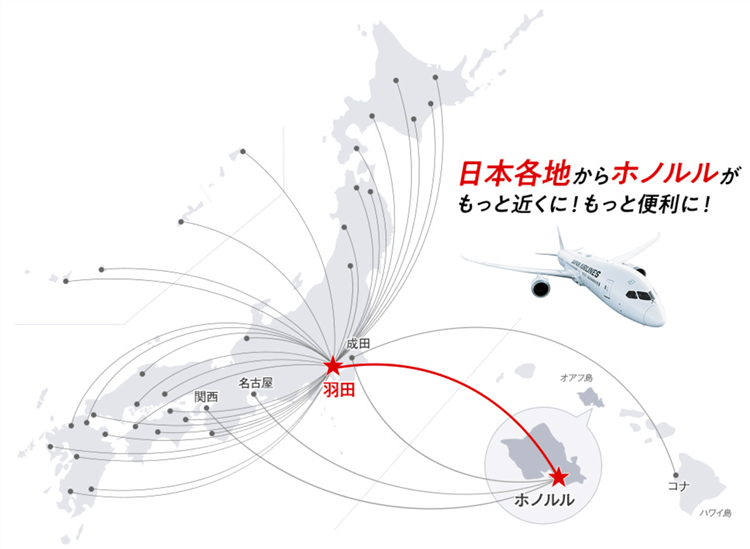 JALのホノルル直行便は国内4か所(成田、羽田、名古屋、関西)!組み合わせや乗継ぎも可能!!