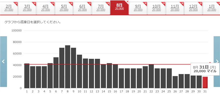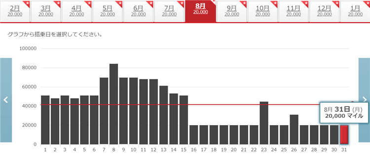 前半はお盆シーズンや夏休みということもあり、どちらも必要マイル数が4万マイル前後とかなりお高めとなります。