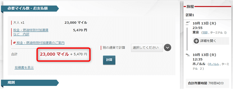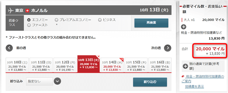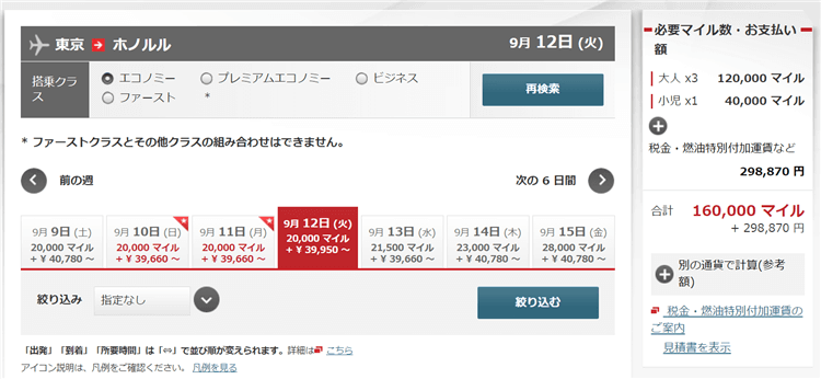 ホノルルまでJALマイルを使っていく場合はこのようになります。