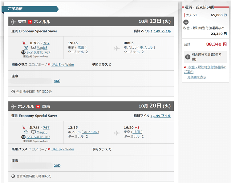 下記は2020年10月13日の日程で成田-ホノルルのチケットになります。