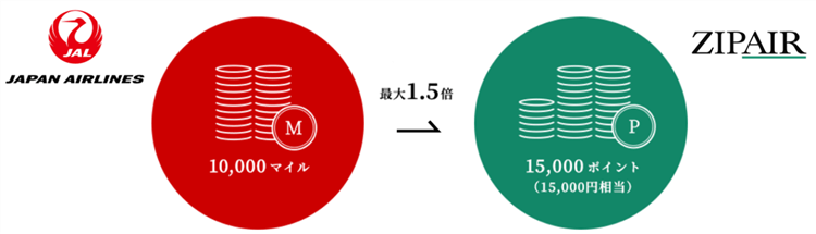 10,000マイル単位分 - 1JALマイル ⇒ 1.5ZIPAIRポイント