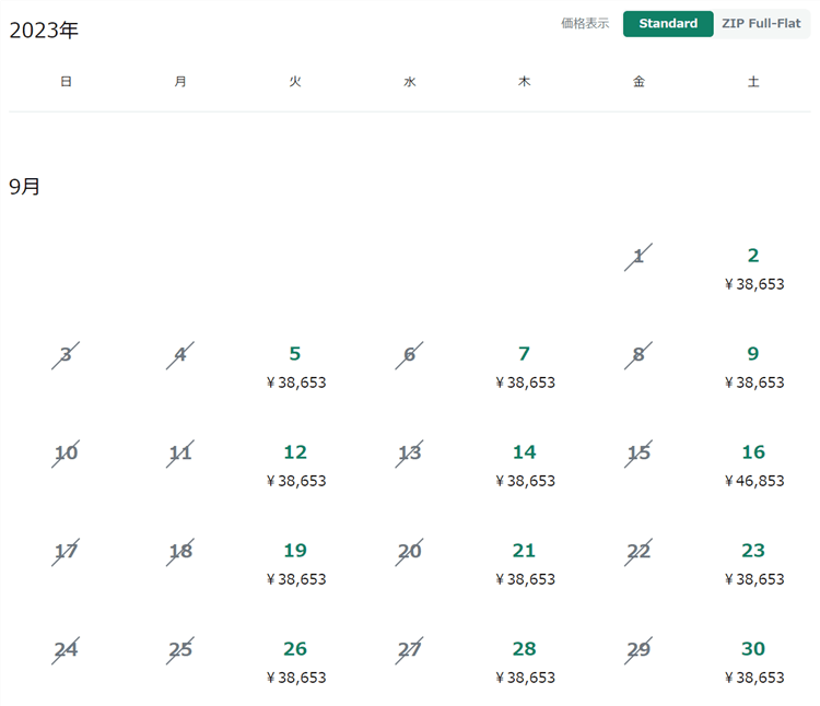 こちらは2023年9月の片道(往路)Standard(エコノミー)料金です。