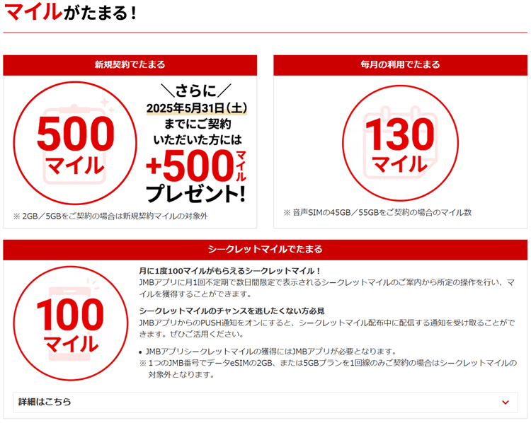 では上記のJALモバイルのプランで貰える特典、マイルはというとこんな感じです。
