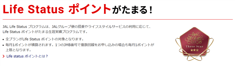 Life Status ポイントというのはJALの生涯プログラムでこれを貯めることによって、憧れのJGCに到達できるんです。