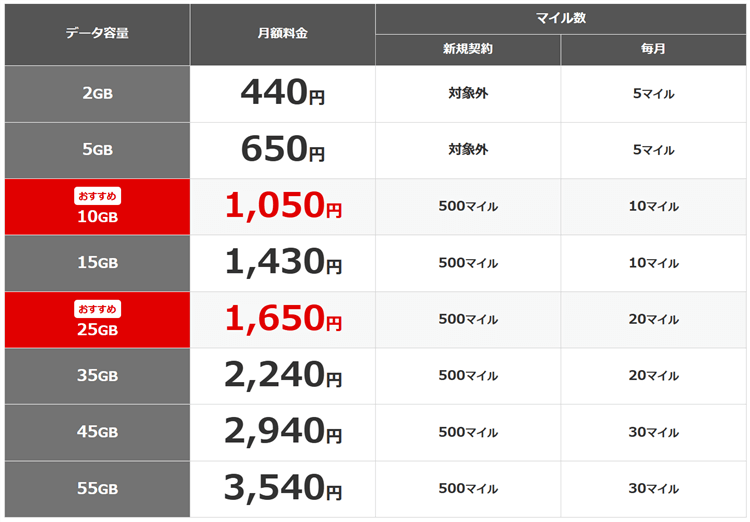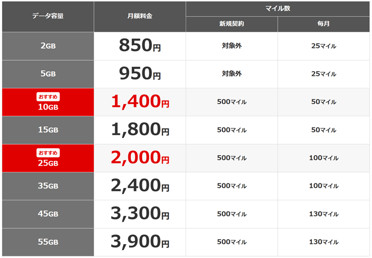 毎月の料金プランに応じてJALマイルが貰えるようになります!